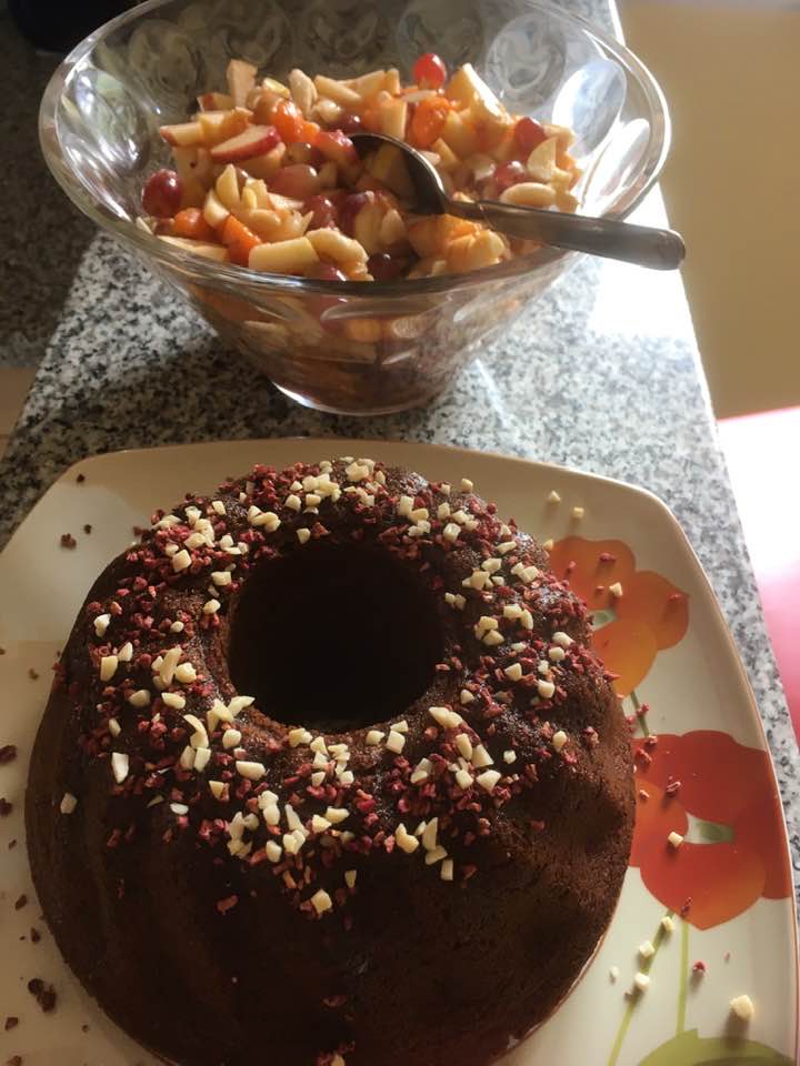 Und dazu ein frischer Obstsalat, und als Krönung ein großer Klecks Sahne!