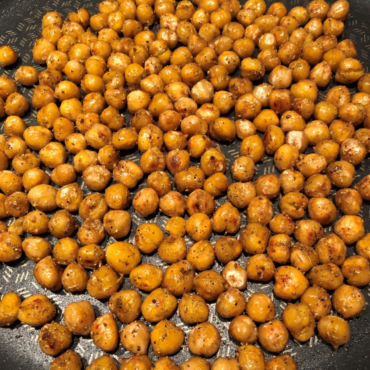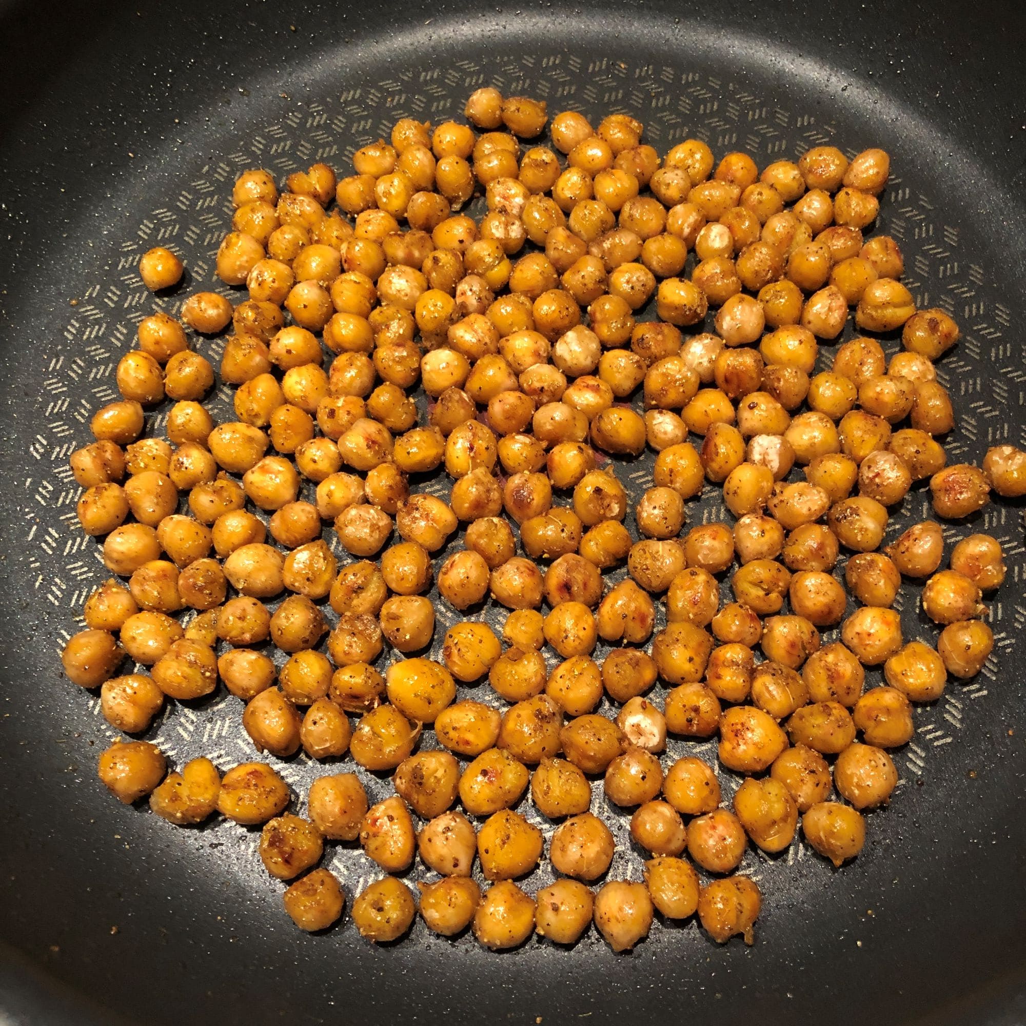 Die Kichererbsen kann man entweder im Backofen oder in der Pfanne rösten. Ich bevorzuge die Pfanne, das geht ganz nebenbei und man hat die Erbsen besser im Blick als im Ofen und kann selbst entscheiden, wie knusprig man es mag. Auch ein bisschen mehr Öl tut den Knusperchen manchmal noch gut. Und – wer es mag – zum Schluss noch frischer Knoblauch.