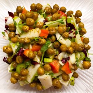 Mein Topping heute sind knusprig geröstete Kichererbsen, also Hülsenfrüchte, und so verbinden sich Vitamine und Mineralstoffe aus Salat und Gemüse mit dem pflanzlichen Eiweiß der Kichererbsen zur vollwerten Mahlzeit.
